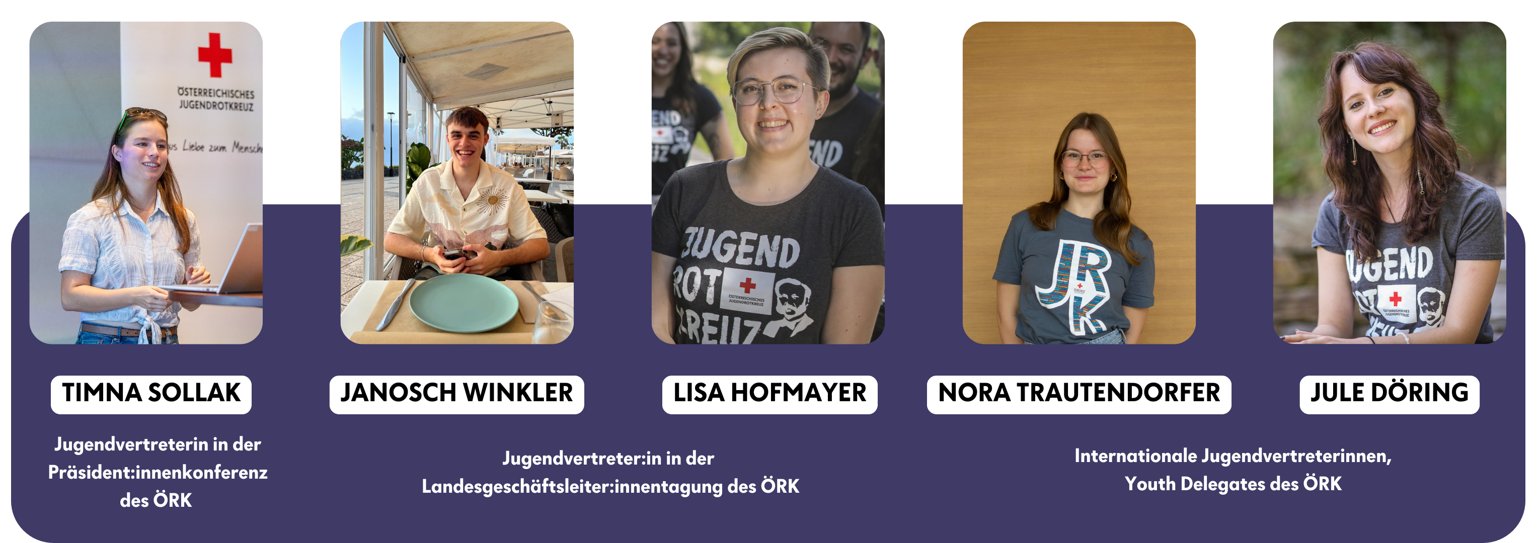 Die bundesweiten Jugendvertreter:innen des Österreichischen Jugendrotkreuzes sind Ansprechpersonen für Jugendthemen in den höchsten Gremien des Roten Kreuzes. Sie setzen sich für die Einbindung junger Menschen in vorzubereitenden Beschlüssen in den verschiedenen Leistungsbereichen des Österreichischen Roten Kreuzes ein.
