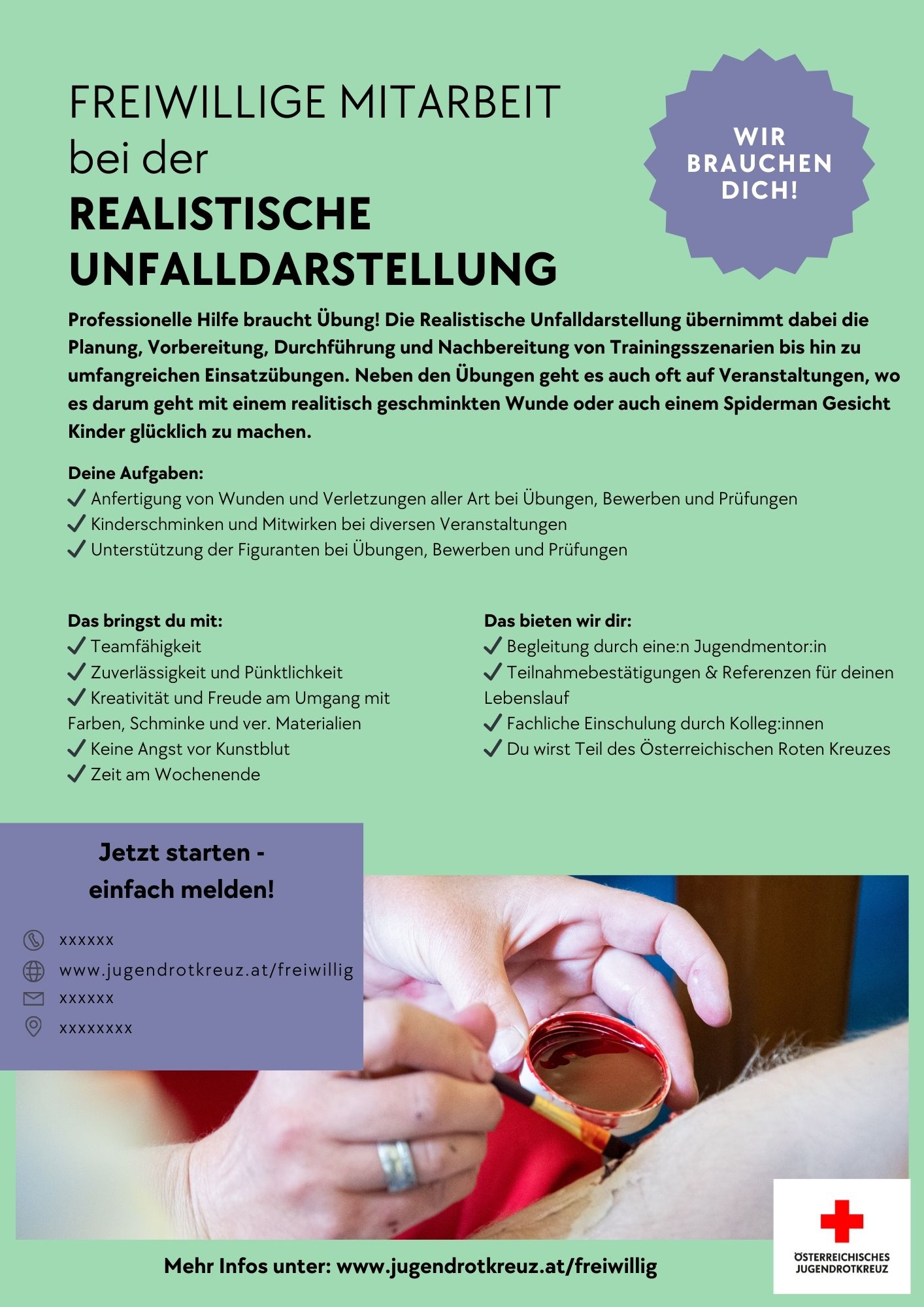Professionelle Hilfe braucht Übung! Bei der Realistischen Unfalldarstellung planst, bereitest du vor und führst Trainingsszenarien und große Einsatzübungen durch. Außerdem bist du bei Veranstaltungen dabei – mal mit realistischen Wunden, mal mit kreativem Facepainting wie Spiderman, um Kinder zu begeistern.