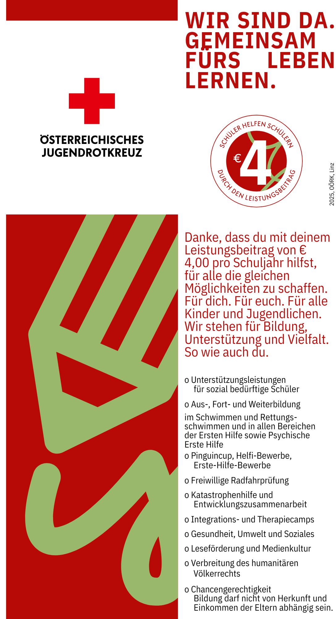 Als kleines Dankeschön für Schüler:innen für die Spende des Leistungsbeitrages bzw. als Information für die Eltern können hier kostenlose Lesezeichen in Schüler:innenanzahl für Schulen in Oberösterreich bestellt werden.